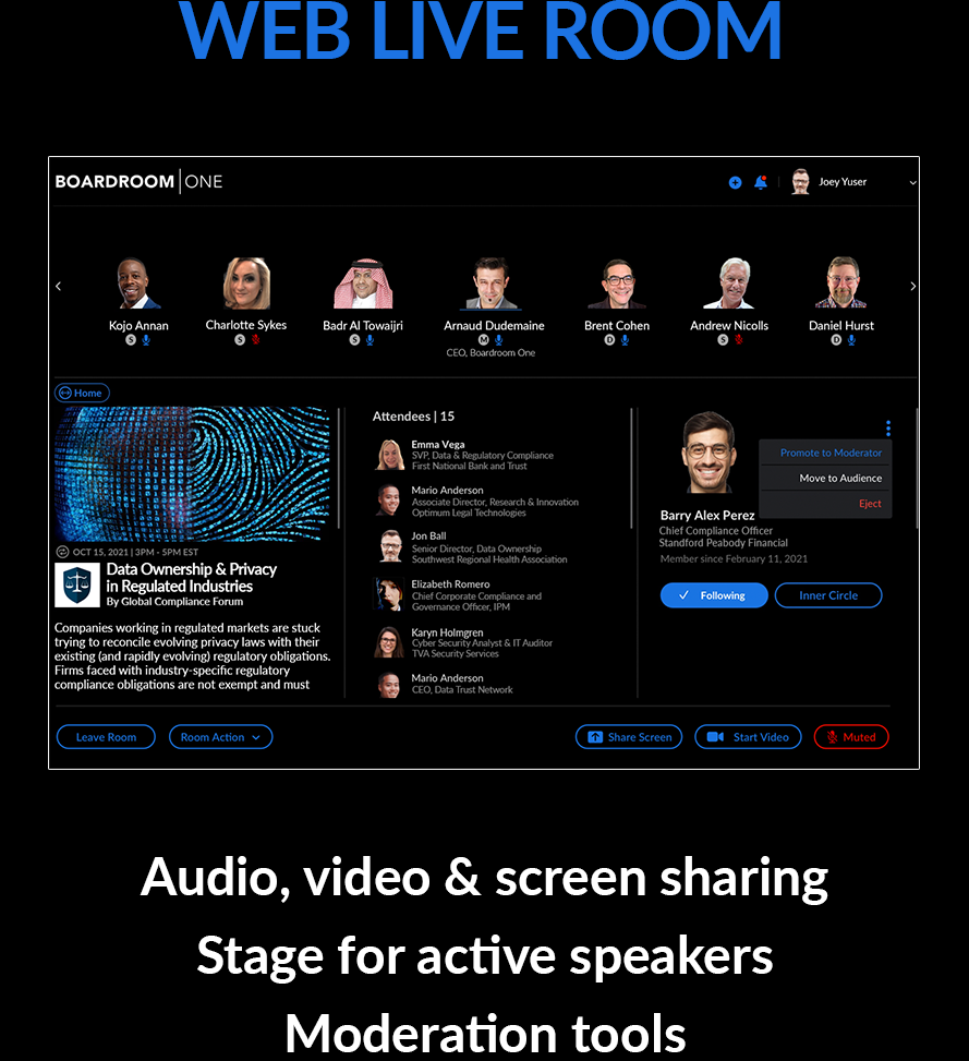 Focus on what matters — Integrate Boardroom One seamlessly into your workflows and gain access to an efficient, more secure way to communicate, network, and engage.